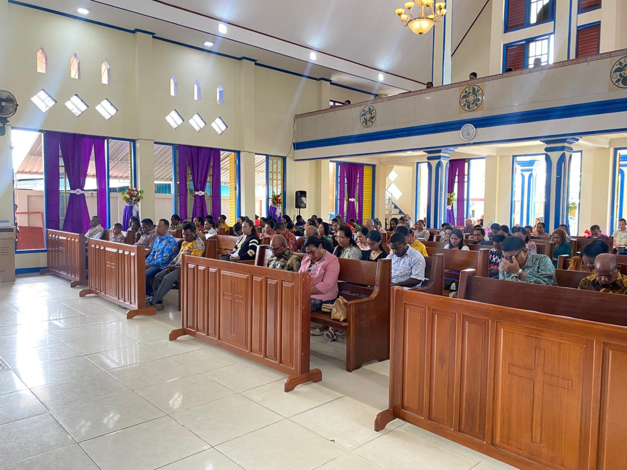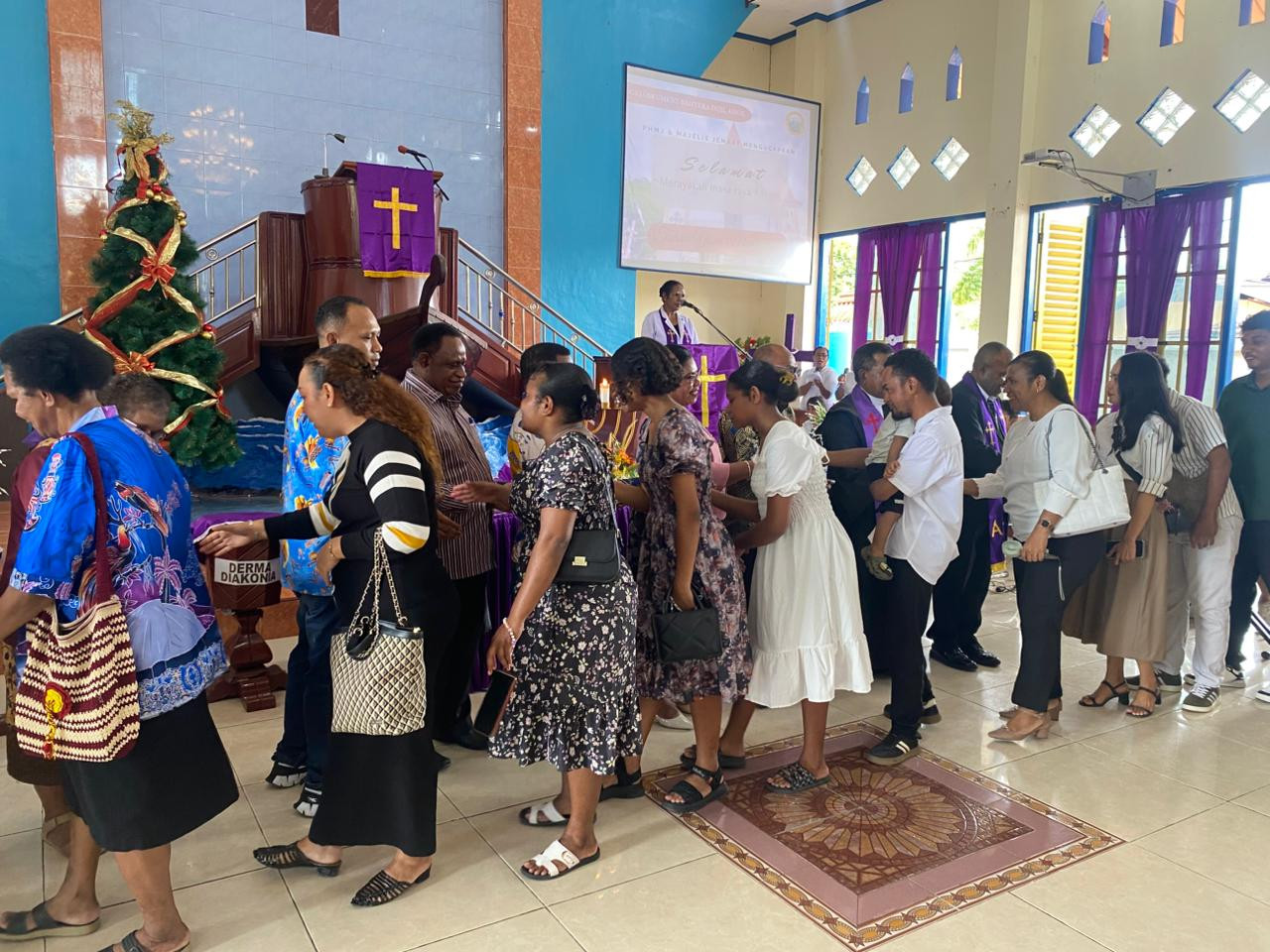 KOTA SORONG – Wali Kota Sorong, Septinus Lobat, S.H., MPA., didampingi Ketua Tim Penggerak PKK Kota Sorong, Ny. Jemima E. Lobat, SKM., MAP, menghadiri Ibadah Minggu Pagi di Gedung Gereja GKI Oikumene Bahtera Injil Aspol, Minggu (7/12/2025).