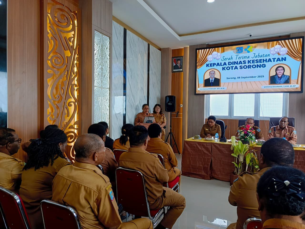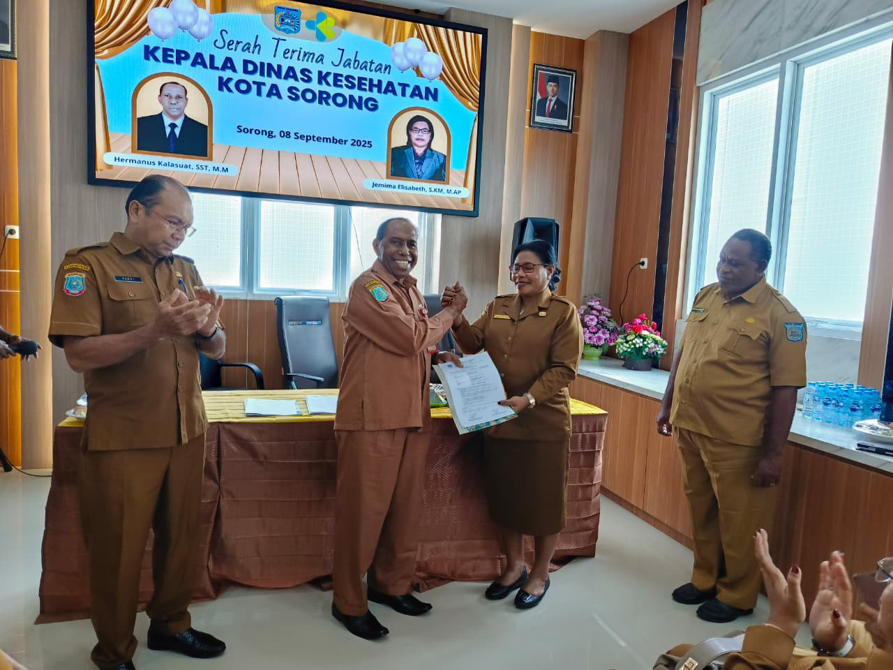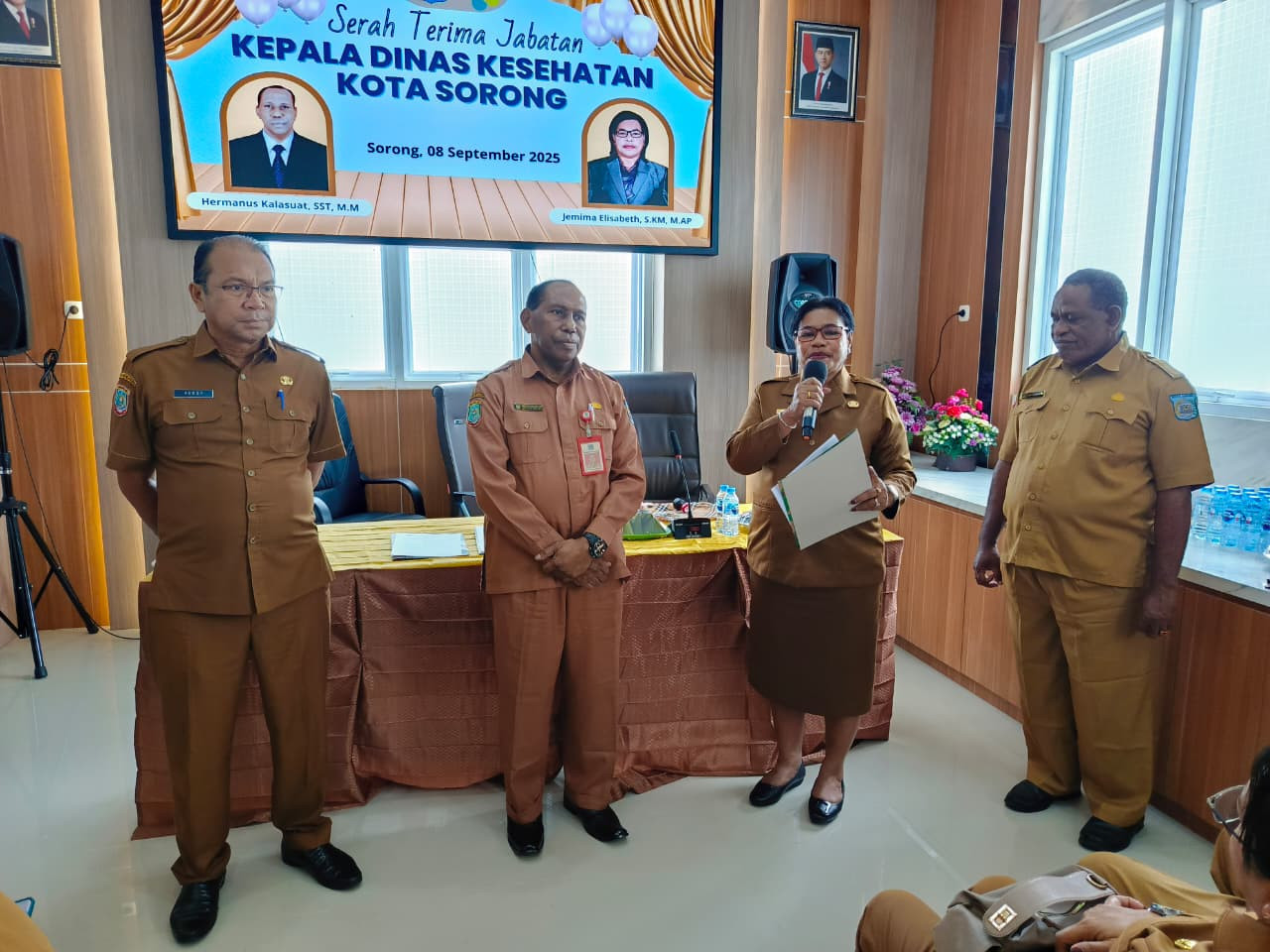 Kota Sorong - Plt. Sekda Kota Sorong, Rudy R. Laku, S.Pi., MM., hadir pada Serah Terima Jabatan, Kepala Dinas Kesehatan, Hermanus Kalasuat, SST., M.M kepada Jemima Elisabeth, S.KM., M.AP. Kantor Dinas Kesehatan. Senin, (8/9/2025).