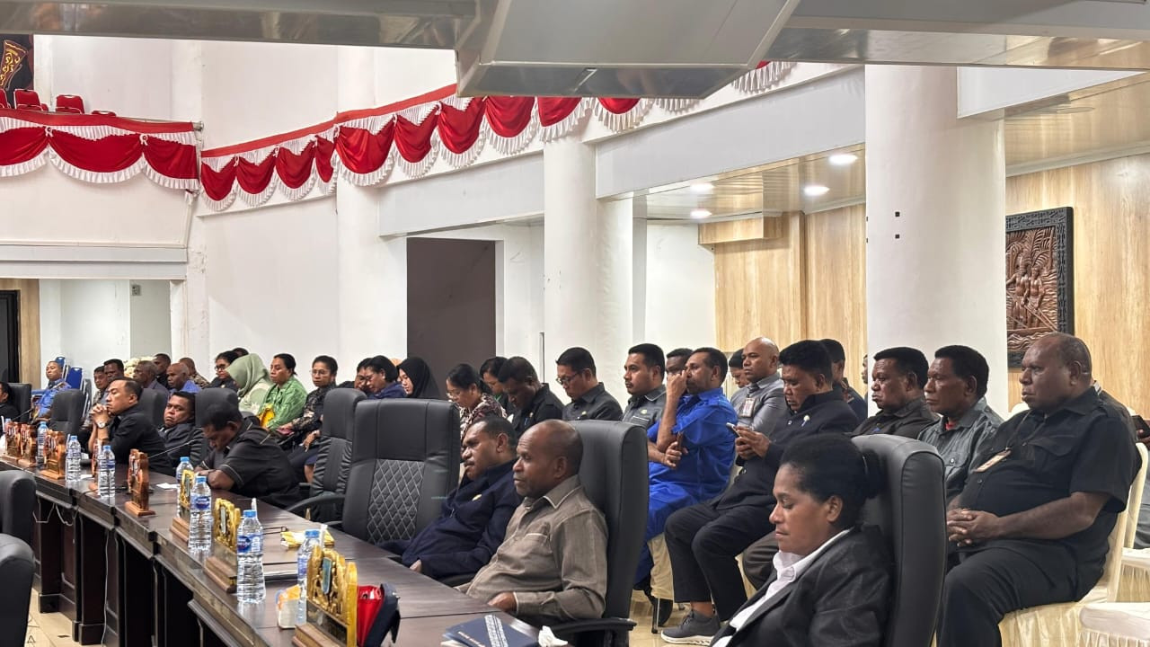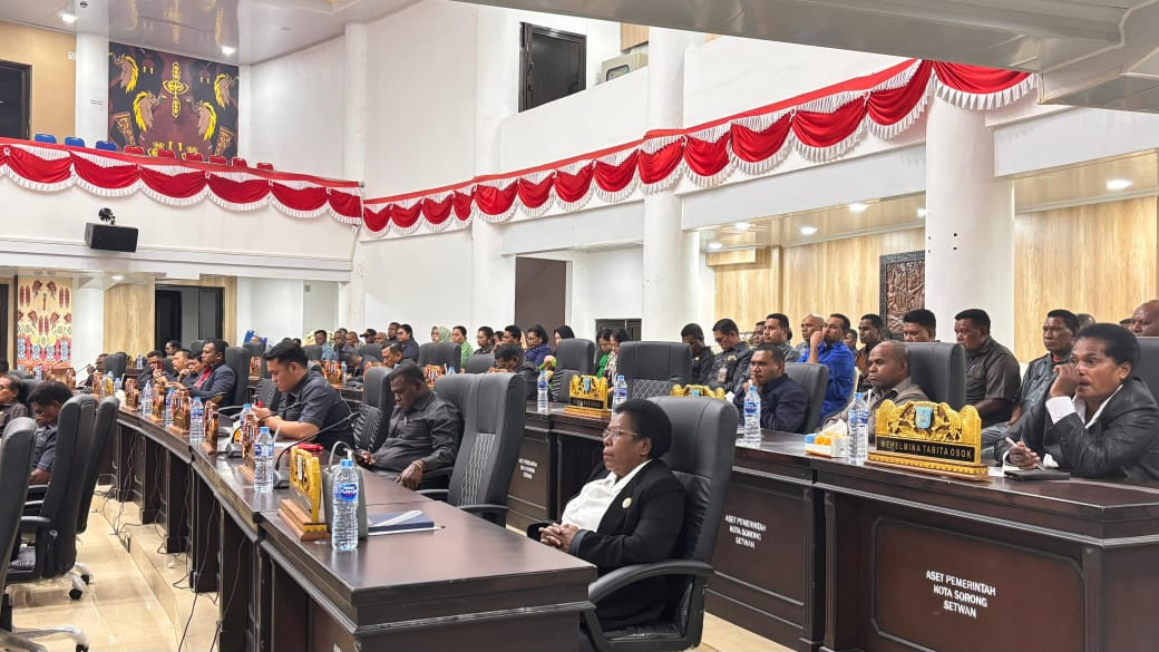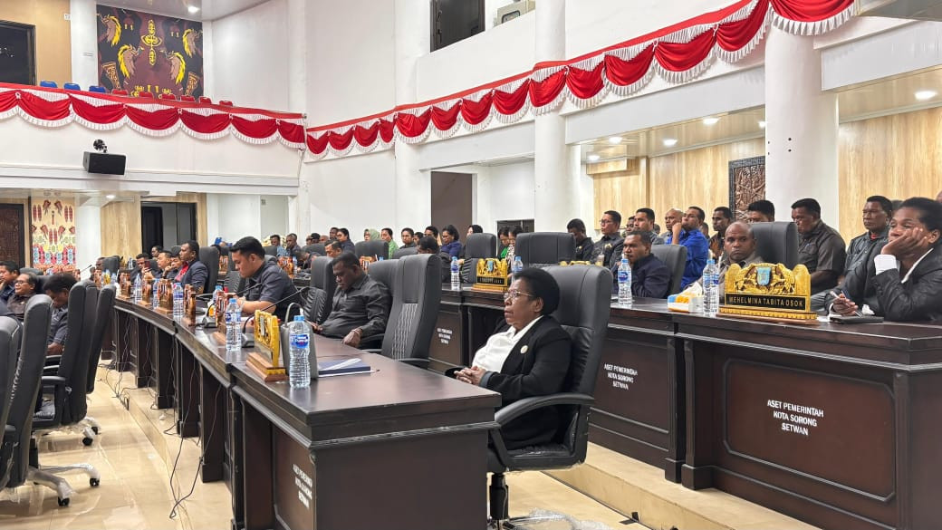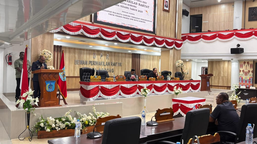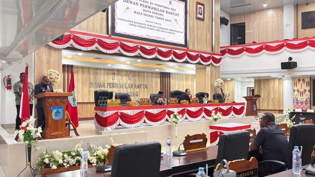SORONG – Wali Kota Sorong, Septinus Lobat, S.H., M.P.A., menghadiri Rapat Pleno XV Paripurna XXII DPR Kota Sorong Masa Sidang Tahun 2025 dengan agenda penyampaian tanggapan Wali Kota Sorong terhadap pandangan umum fraksi-fraksi DPR Kota Sorong terkait Raperda Pertanggungjawaban APBD Pemerintah Kota Sorong Tahun Anggaran 2024. (12/9/2025)