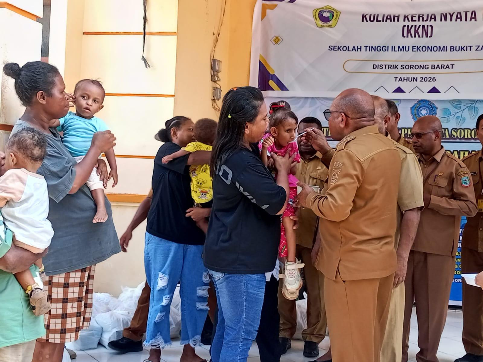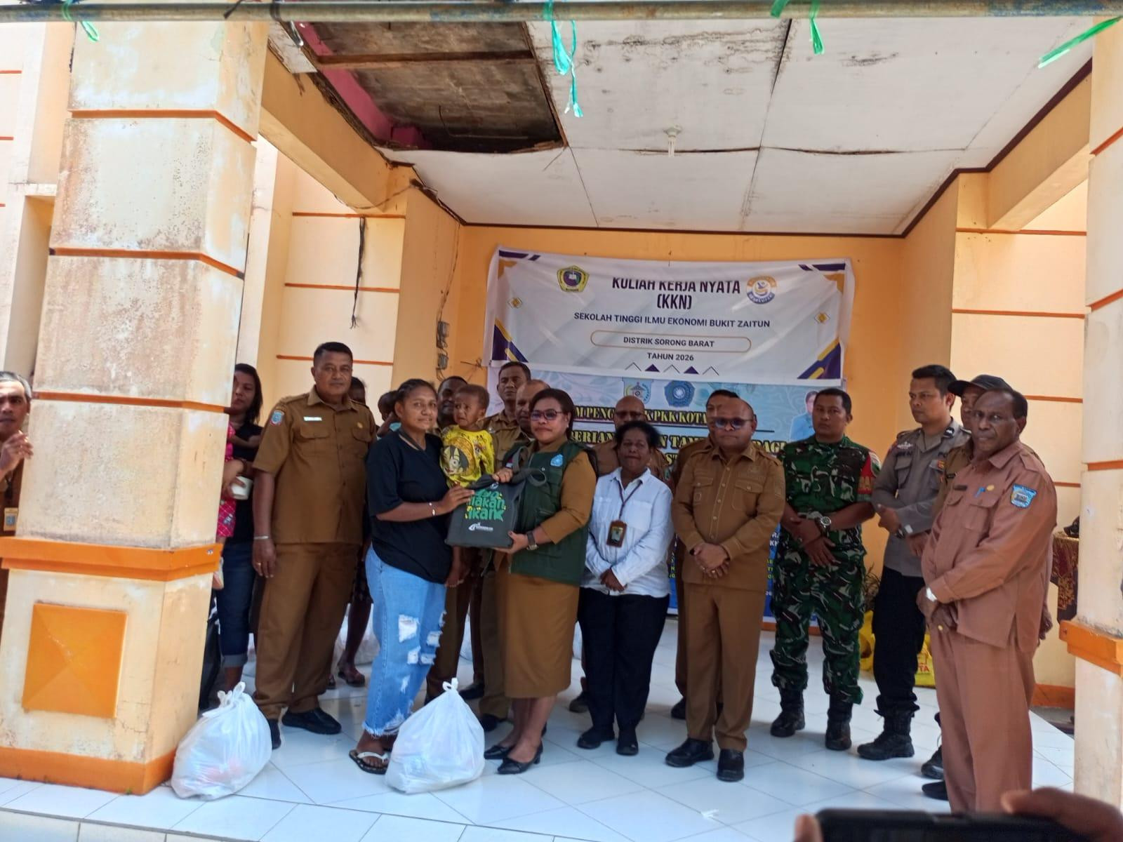 Pemerintah Kota Sorong berkolaborasi dengan mahasiswa Kuliah Kerja Nyata (KKN) STIE Bukit Zaitun Sorong, melaksanakan kegiatan pemberian makanan tambahan (PMT) bagi bayi dan balita yang mengalami stunting di Distrik Sorong Barat. Kegiatan tersebut berlangsung pada Senin (9/3/2026) pukul 09.30 WIT di Kantor Distrik Sorong Barat.