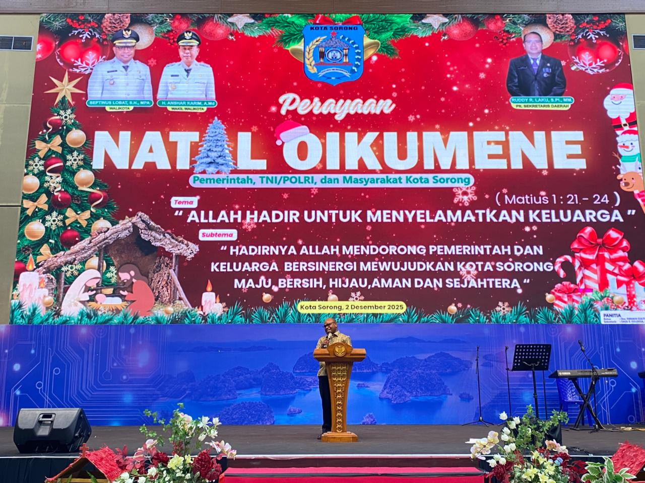 KOTA SORONG – Suasana khidmat dan penuh persaudaraan menyelimuti Perayaan Natal Oikumene Pemerintah, TNI/Polri, dan Masyarakat Kota Sorong. Acara tahunan yang diselenggarakan di Gedung Drs. Ec. L. Jitmau, Selasa malam (3/12/2025), ini menjadi wujud nyata komitmen seluruh elemen di Sorong untuk memperkuat persatuan dan pelayanan publik.