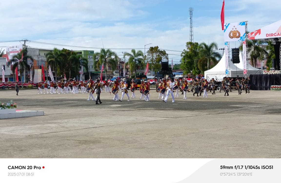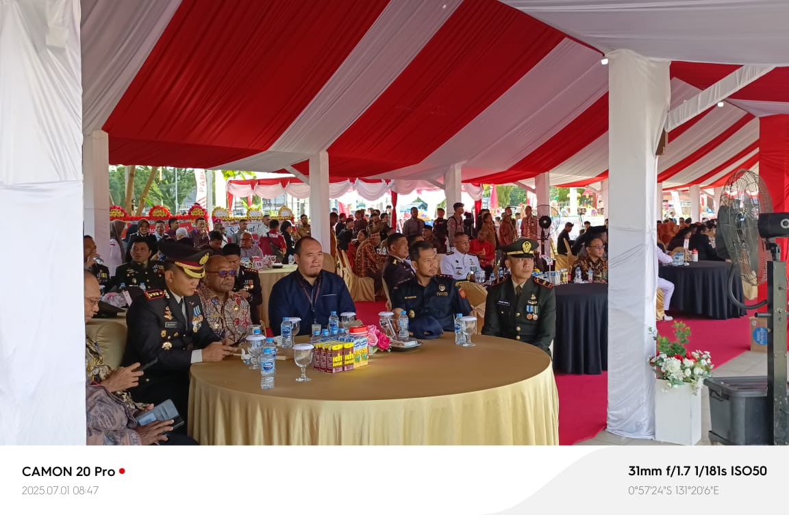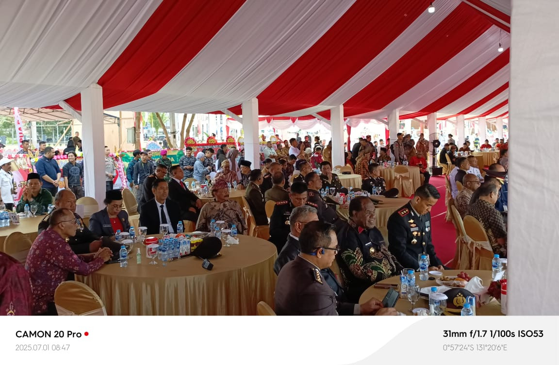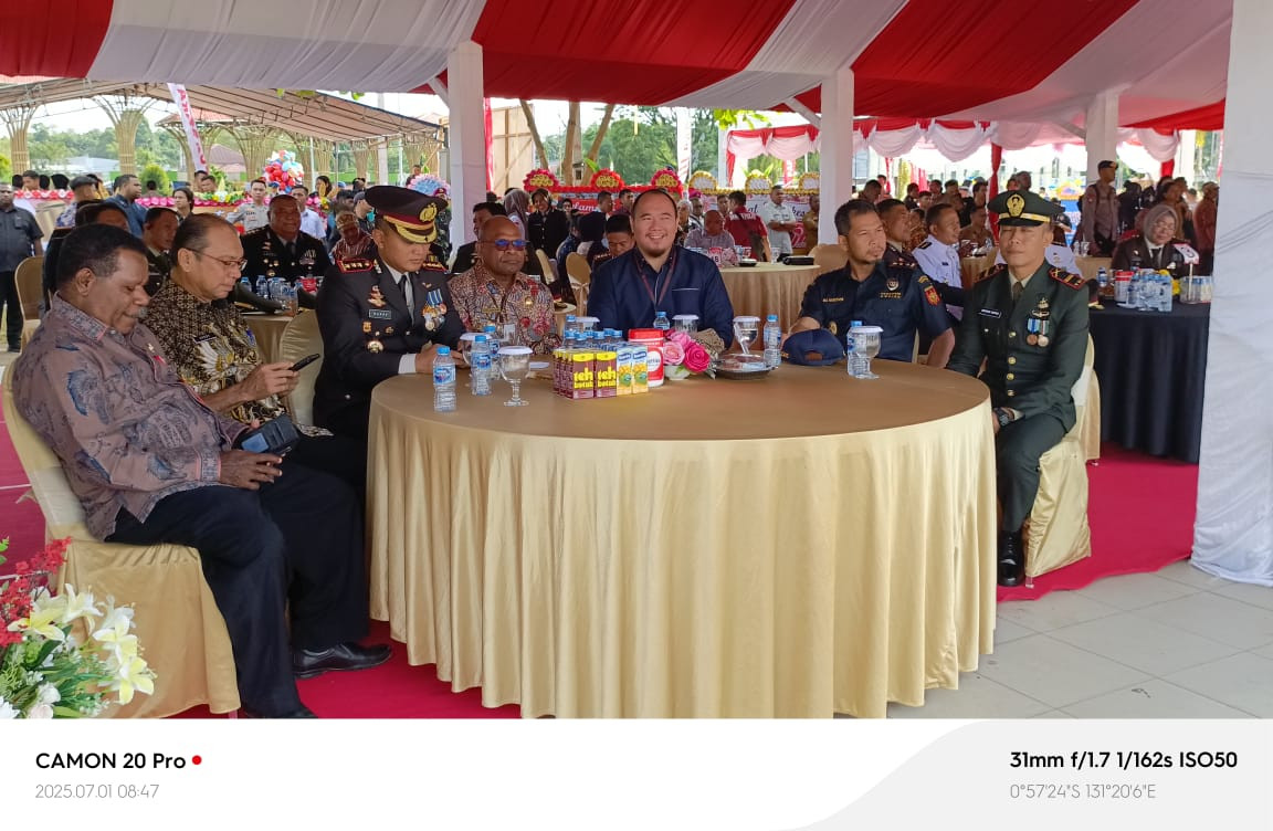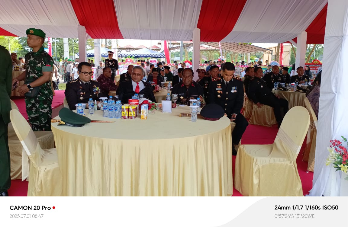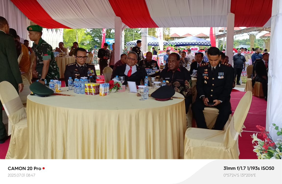 BERITA FOTO Wali Kota Sorong, Septinus Lobat, S.H., M.P.A., bersama Plt. Sekda Ruddy R. Lakku, S.Pi., M.M., menghadiri upacara peringatan Hari Ulang Tahun Bhayangkara ke-79 yang digelar di Alun-Alun Aimas. Selasa (1/7/2025). Upacara tersebut diikuti oleh unsur Forkopimda dari Kota dan Kabupaten Sorong. Dengan mengusung tema “Polri untuk Masyarakat”, kegiatan ini menjadi momentum refleksi peran Polri dalam memberikan pelayanan terbaik bagi masyarakat dan menjaga keamanan di wilayah Sorong Raya.
