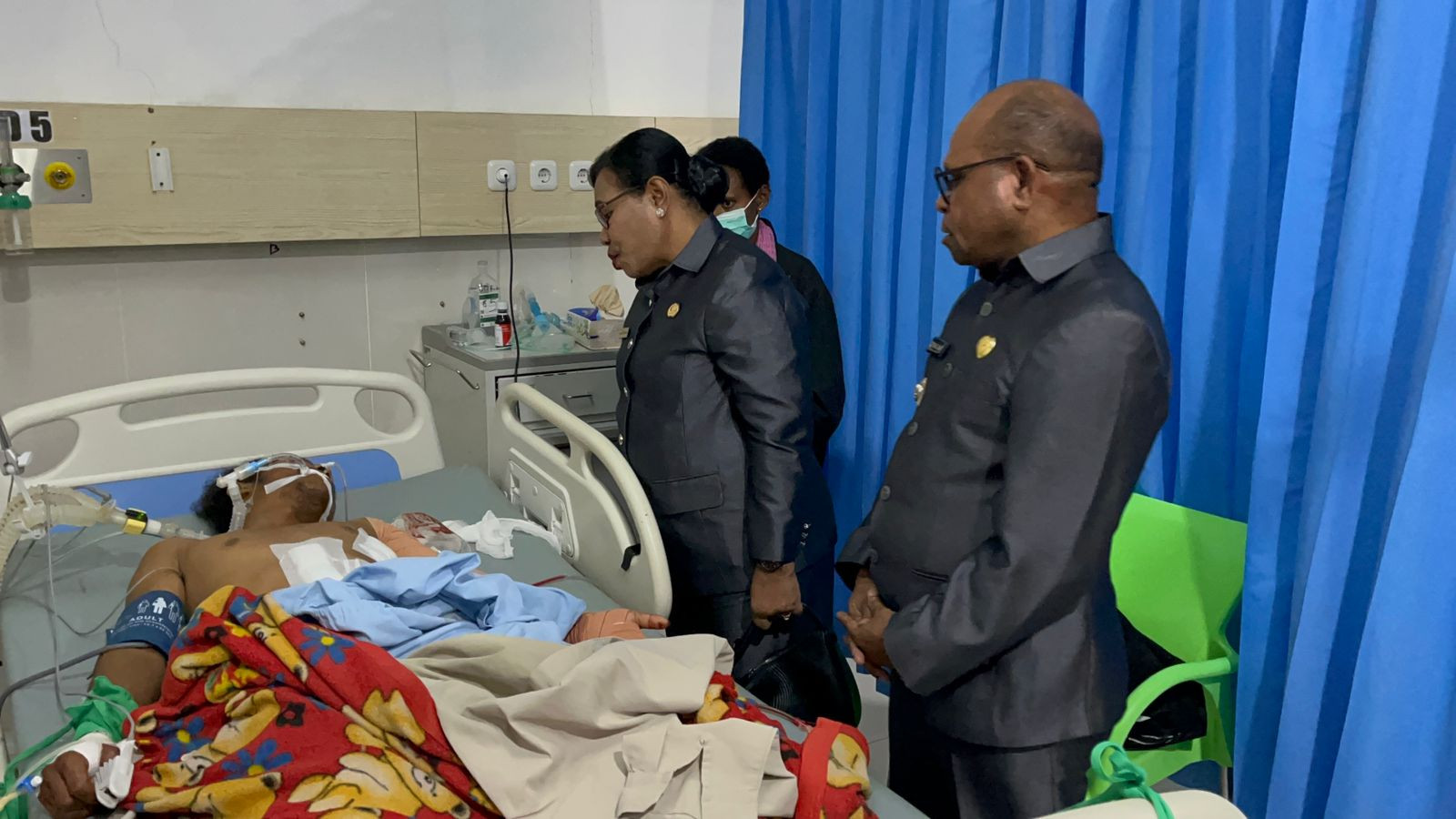 KOTA SORONG - Wali Kota Sorong, Septinus Lobat, S.H., MPA., didampingi Ketua TP-PKK Kota Sorong Ny. Jemima Elisabet Windesi, S.K.M., M.A.P., bersama beberapa pimpinan OPD Pemerintah Kota Sorong membesuk salah satu korban atas nama Maikel Welerubun yang sedang menjalani perawatan akibat terkena tembakan pada bentrok yang terjadi pada hari Rabu, (27/08/2025) di rumah sakit Sele Be Solu Kota Sorong. Kamis, (28/08/2025).