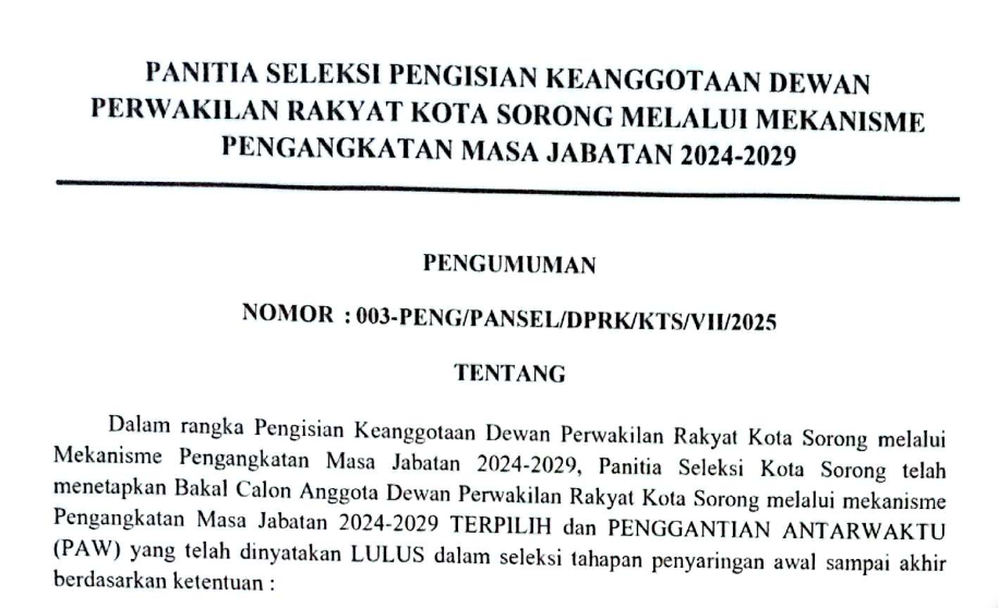 PRESS RELEASE PEMERINTAH KOTA SORONG Panitia Seleksi Pengisian Keanggotaan Dewan Perwakilan Rakyat Kota Sorong Melalui Mekanisme Pengangkatan Masa Jabatan 2024-2029...