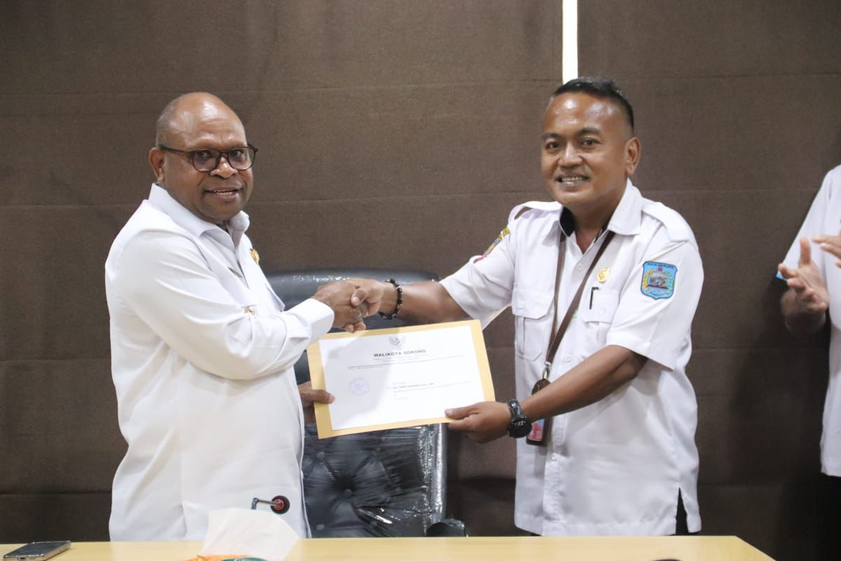 Kota Sorong — Wali Kota Sorong, Septinus Lobat, S.H., MPA., secara resmi menyerahkan Surat Keputusan Wali Kota Nomor: 800.1.4/1182/BPKSDM/2025 Tentang...